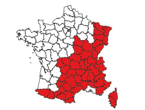 Les départements concernés sont les suivants: Ain, Allier, Alpes-de-Haute-Provence, Hautes-Alpes, Alpes-Maritimes, Ardèche, Ariège, Aube, Aveyron, Cantal , Corrèze, Côte-d'Or , Creuse, Doubs, Drôme, Gard, Haute-Garonne, Hérault, Isère, Jura, Loire, Haute-Loire, Lot, Lozère, Meurthe-et-Moselle, Moselle, Nièvre, Puy-de-Dôme, Pyrénées-Atlantiques, Hautes-Pyrénées, Pyrénées-Orientales, Bas-Rhin, Haut-Rhin, Rhône, Haute-Saône, Saône-et-Loire, Savoie , Haute-Savoie, Tarn, Tarn-et-Garonne, Var, Vaucluse, Haute-Vienne, Vosges, Yonne, Le Territoire de Belfort, Corse-du-Sud, Haute-Corse.